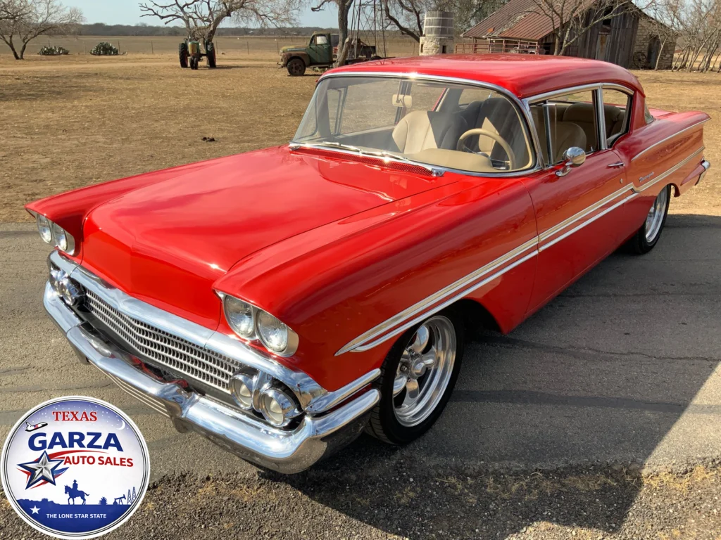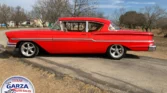 1958 Biscayne with 350 V8, Holley carb, Muncie 4-speed, power steering, power brakes, and custom leather interior.