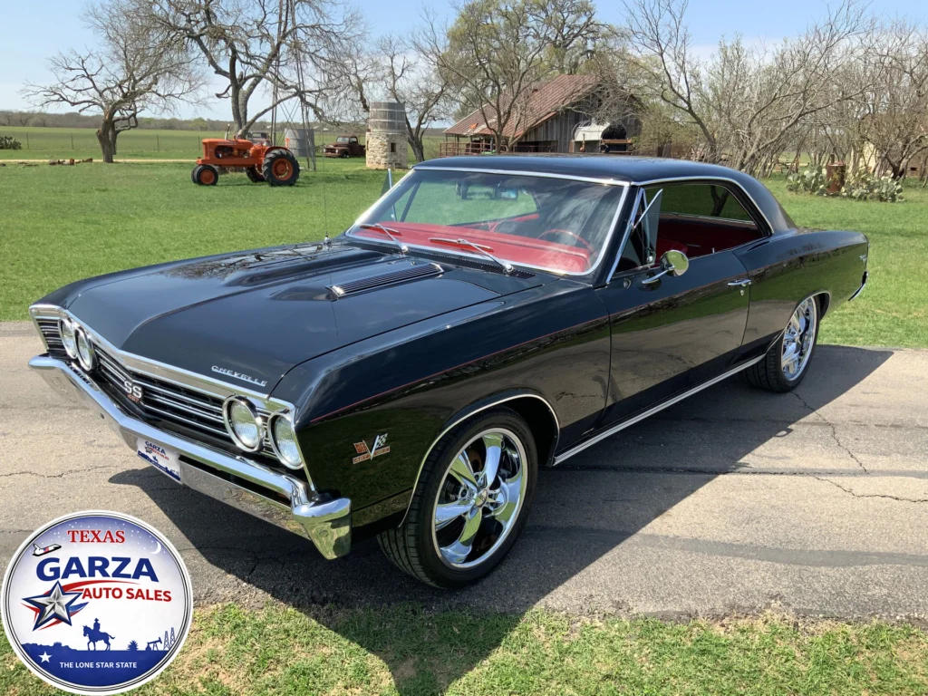 Beautiful Tuxedo Black 1967 Chevelle with a 427 V8, 4-speed manual, and a stunning red interior.